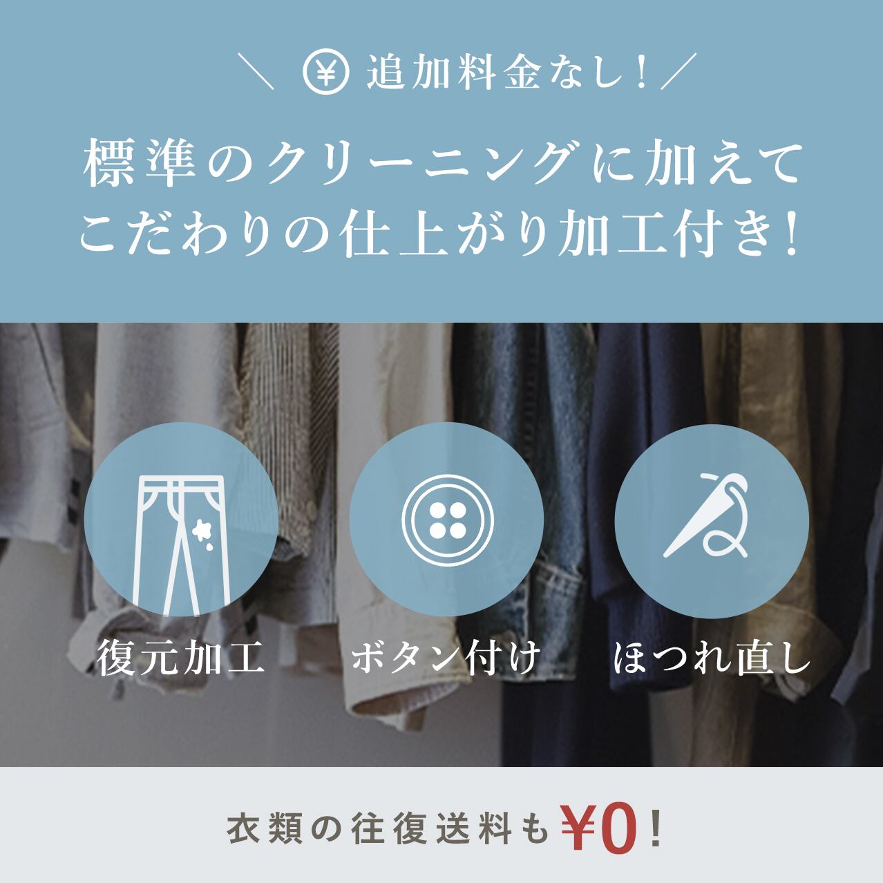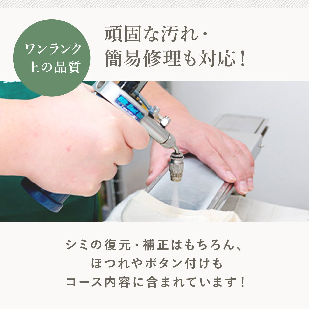 ■標準のクリーニングに加えて、復元加工(しみ抜き)・簡易修理付き!普段のクリーニングよりも気持ちのよい仕上がりでお届けいたします。